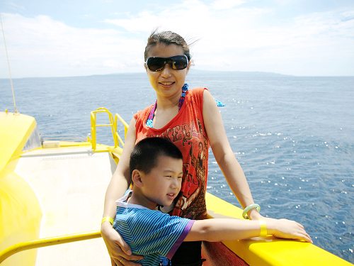 游轮还是挺大的,晕车晕船的要有心里准备,确实蛮晕的,怕晕的不要往高楼层跑,呆在一、二层就好了,找个位置坐好,睡觉。我们一家呆在最顶层,眼瞅着N多人晃得脸色苍白,吐个稀里哗啦,跑下面去了。其实,船是不靠上岛的,只是停在蓝梦岛附近的水面平台,然后是玩各种水上项目,哈哈,孩子们最喜欢了。有香蕉船、滑道、浮潜,半潜水艇,独木舟。。。。。。