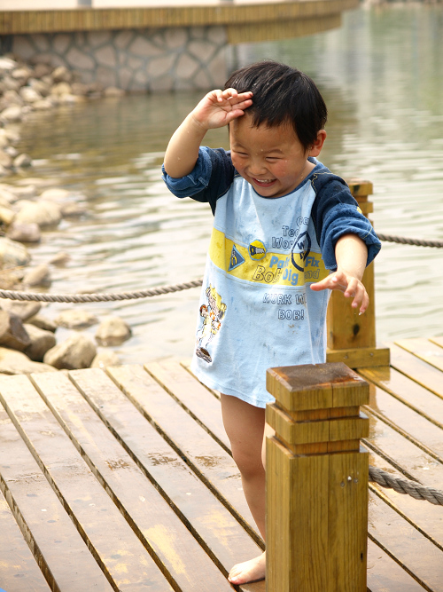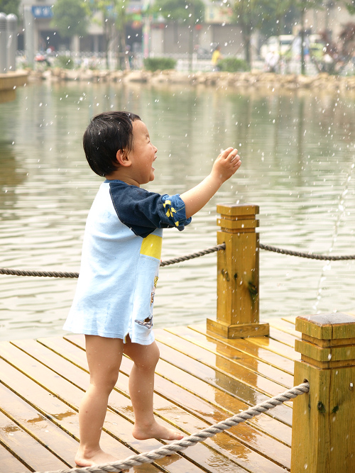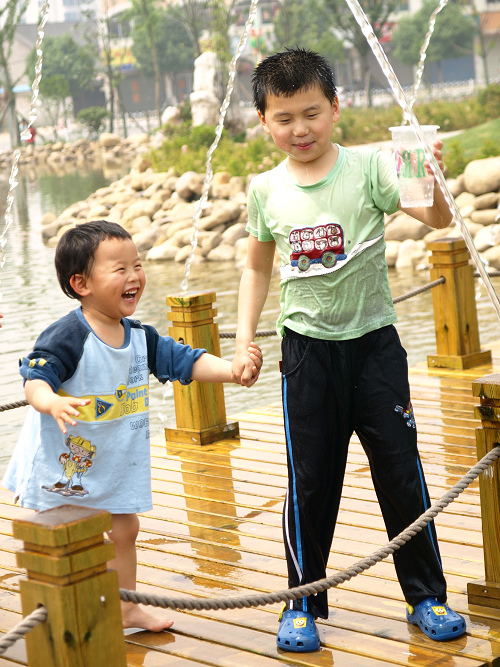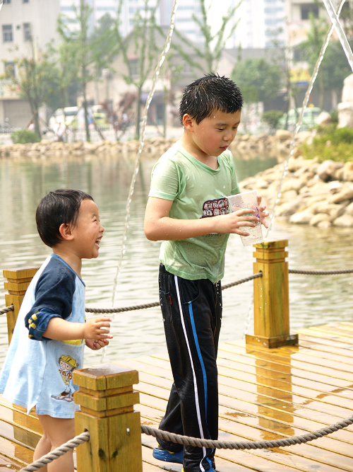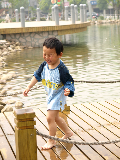 广场上搞活动,我们也去凑热闹,看到水塘,唱唱就走不动路了,一心要捞水里的小鱼,没有收获后,唱唱迷上了那座水桥,玩得不亦乐乎,浑身透湿。小跳跳在一旁看得直尖叫,我们索性把他裤子鞋子脱掉,让他也加入。行人们大都善意地观看着,小朋友们则羡慕万分!!!