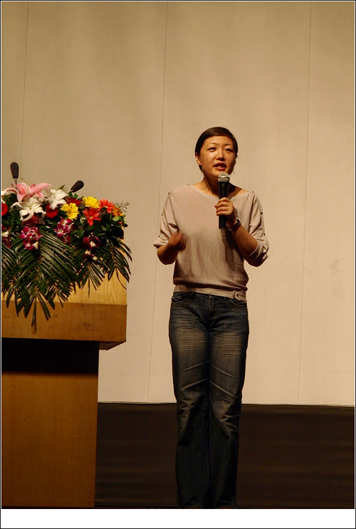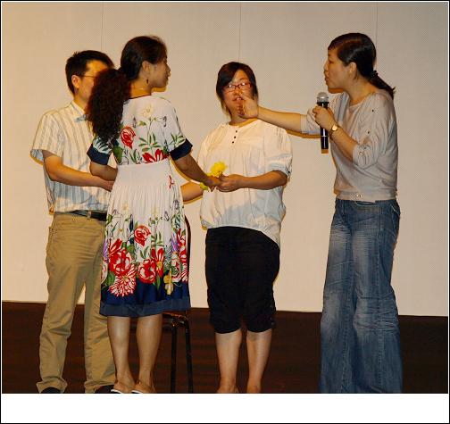 王树老师一开讲,我有一个很明显的感觉,就是——柔软!王老师比我前几年见到得时候更加柔软、柔和,不单单是指她的语言,而是她整体给我的感觉。我也奇怪,为何在我脑海里冒出来的不是“温柔”这个词,而是“柔软”!她站在那里,就是一个发光体,那样的光芒不会刺眼,是一团温暖令你不由想去拥抱。王树老师上台的时候,与主持的穆(还是木?)老师拥抱了一下,我听见周围的骚动,有人“哎呦”以示诧异。而我的眼竟然湿润了。。。。。。开场前几分钟我才发现王老师坐在第一排,想过去问候已经来不及了,于是就想要抓个机会跟王老师拥抱下。呵呵,果然,机会来了,王老师请人上去协助表演时,我积极的举手上了台。有点紧张有点激动,感觉自己的面部肌肉都不受控制,哈哈!过了一会才平静下来。下台的时候,王老师握手谢谢我们,我很直接的说:“不够”,上前抱住了她,也!成功!王老师看着我的眼睛说:“很高兴在这里见到你!”我知道,她知道我想说的一切!