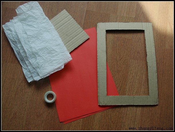 2.说干就干,上班没事的时候,我跑仓库里找了些长方形的废纸板,每块纸板中间挖出了长方形的大窟窿。(窟窿越大越好,糊上透明的白纸,贴上唱唱剪的花,应该不错)