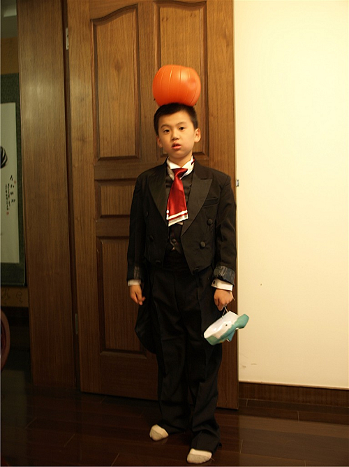 我家这位小朋友正迷游戏《植物大战僵尸》,于是,万圣节一定要扮僵尸,而且告诉我僵尸是穿燕尾服的。。。。